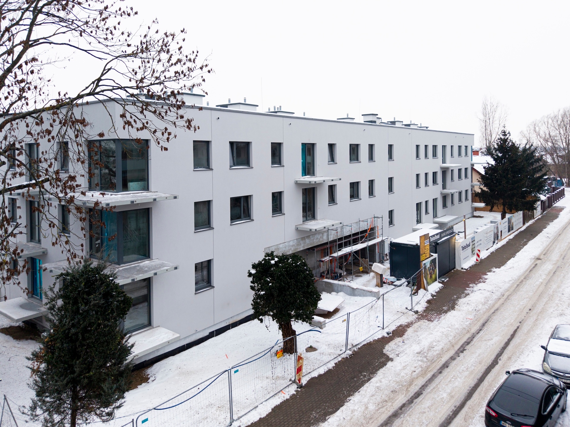 Zakończyliśmy montaż okien w całym budynku, a elewacja jest już niemal gotowa. Kontynuujemy wykonywanie instalacji elektrycznych i sanitarnych, które są już na zaawansowanym etapie. W wielu lokalach wykonano również tynki wewnętrzne, a w części budynku układanie szlicht cementowych.