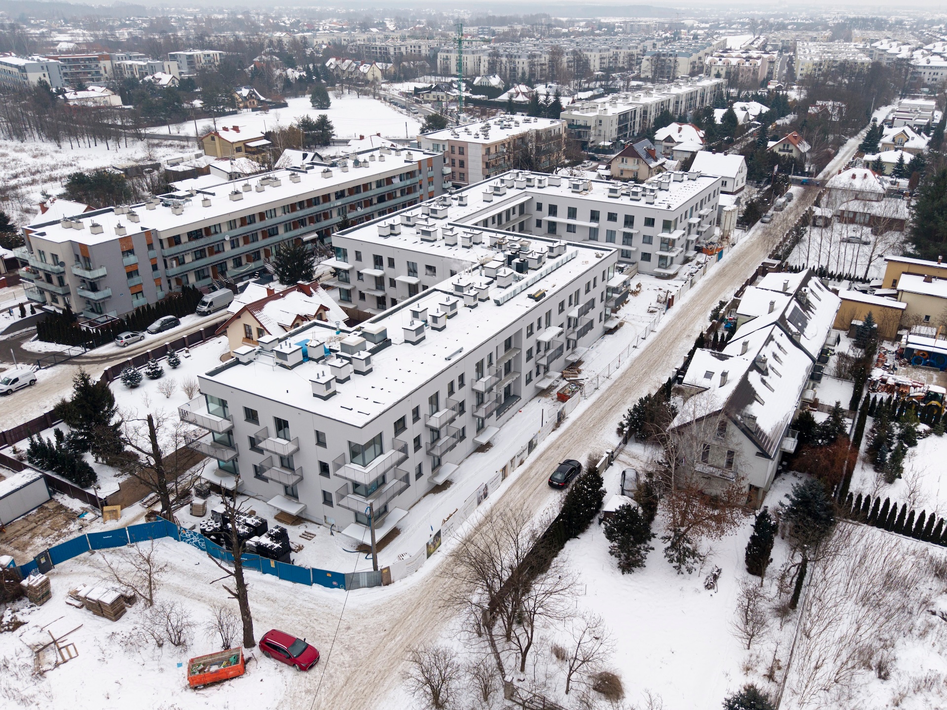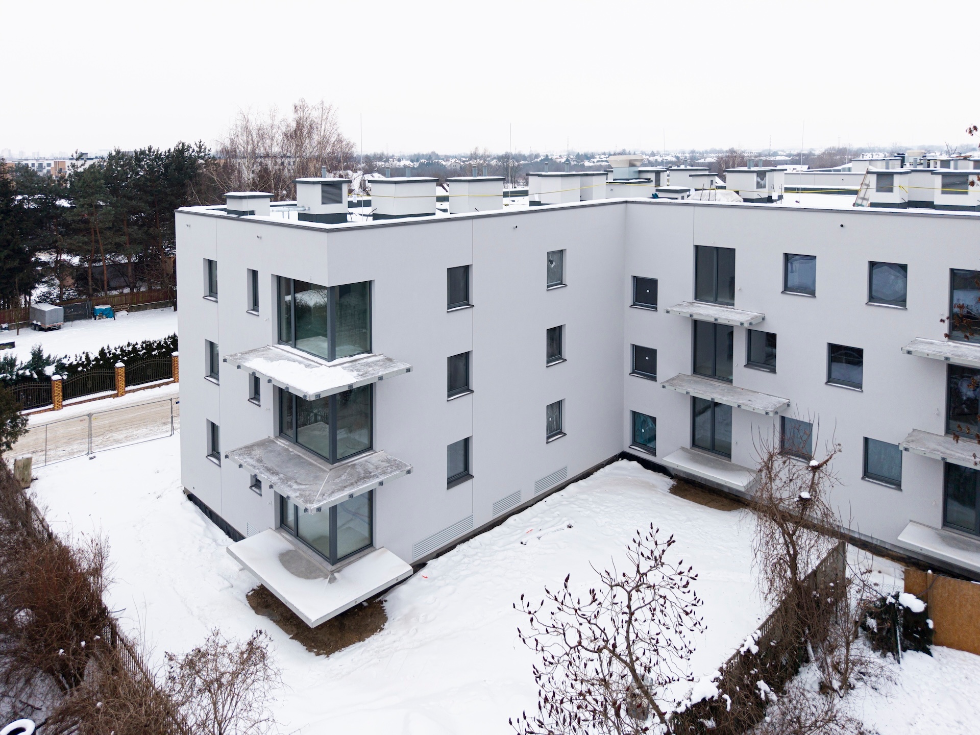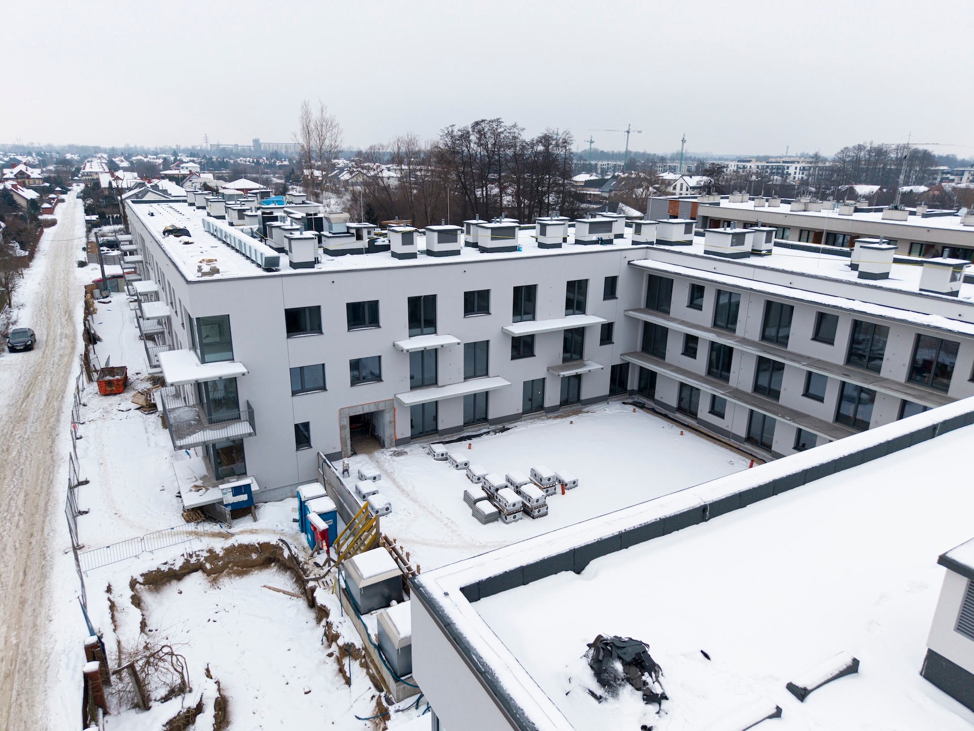 Instalacja elektryczna oraz sanitarna są na zaawansowanym etapie realizacji. Roboty elewacyjne zostały niemal całkowicie zakończone, podobnie jak tynki wewnętrzne. Trwają prace posadzkarskie oraz wykończeniowe w częściach wspólnych, w tym układanie gresów na korytarzach, schodach i w pomieszczeniach technicznych. Prowadzony jest montaż drzwi oraz balustrad balkonowych. Na zewnątrz budynku wykonano większość prac związanych z niwelacją terenu. Zakończono realizację przyłączy gazowych i światłowodowych, a kotłownia gazowa została uruchomiona i ogrzewa budynek.