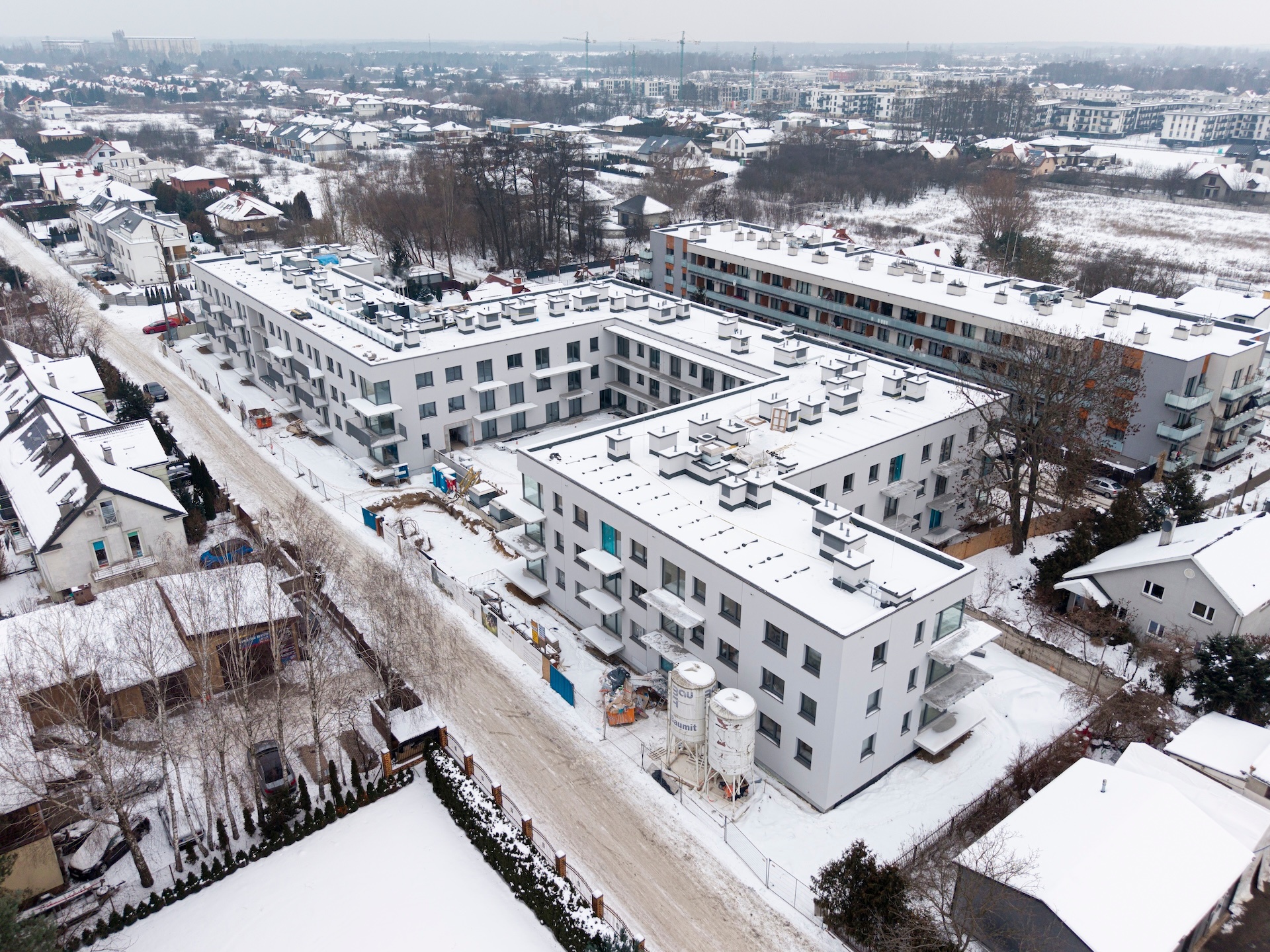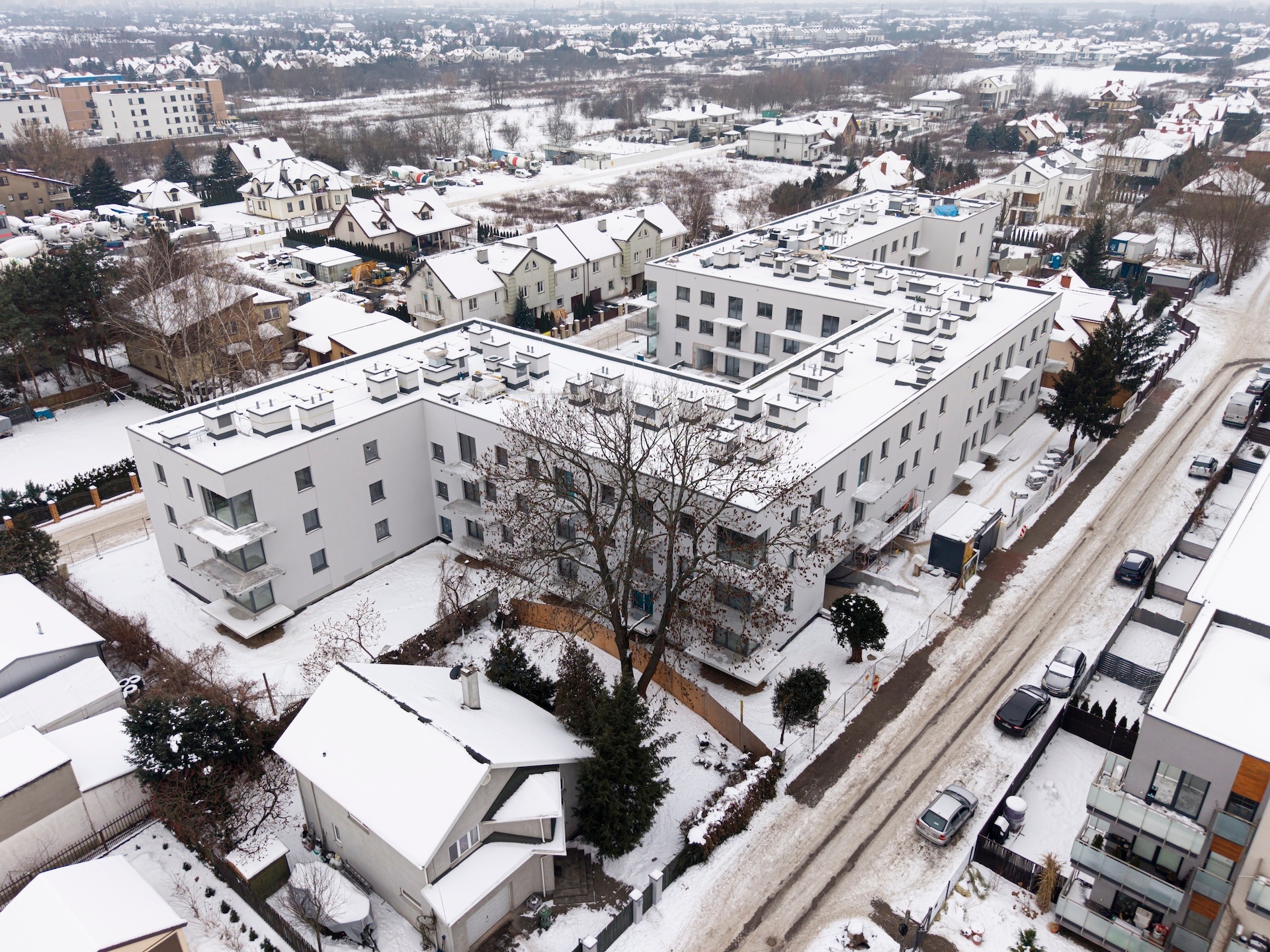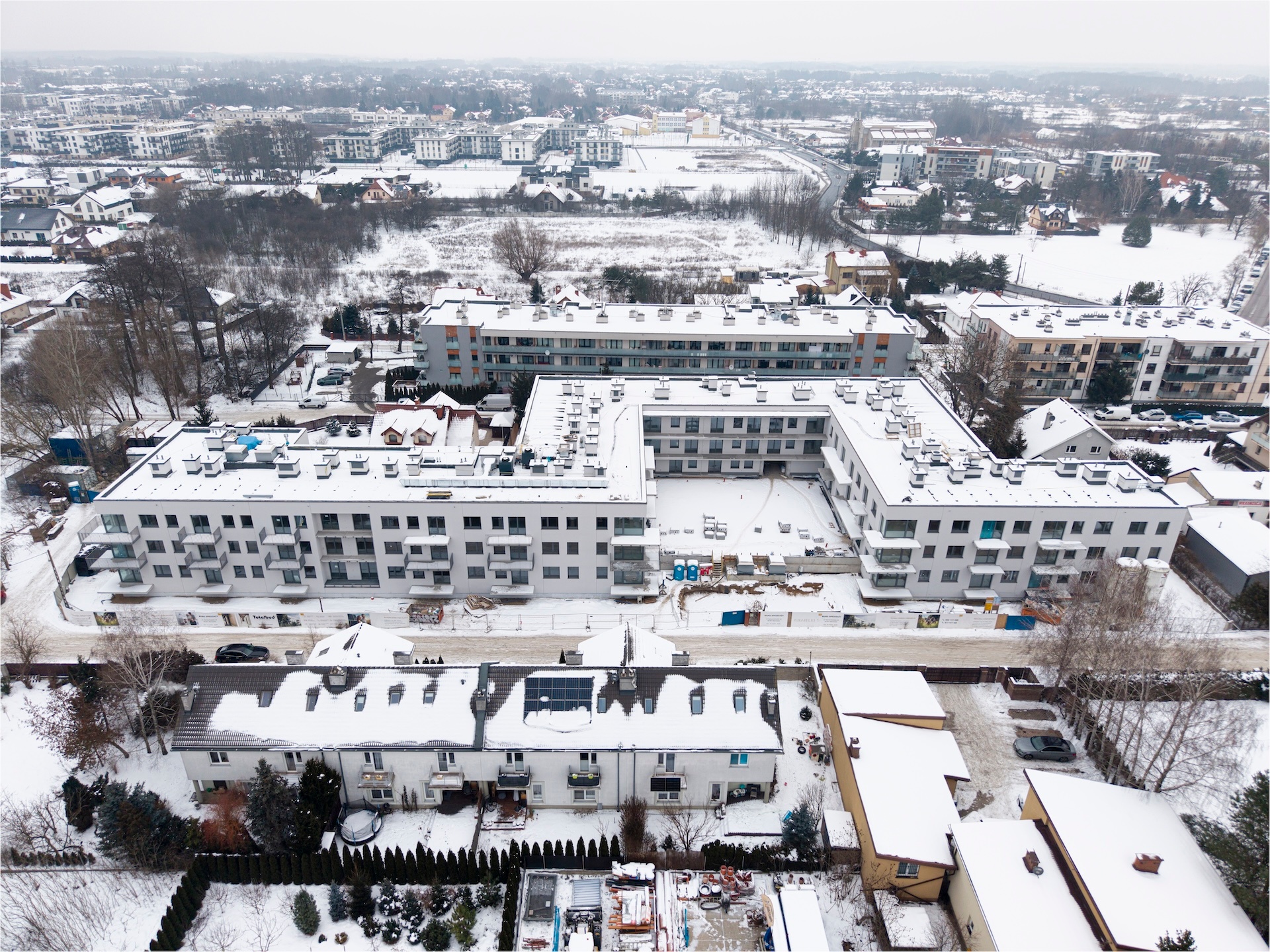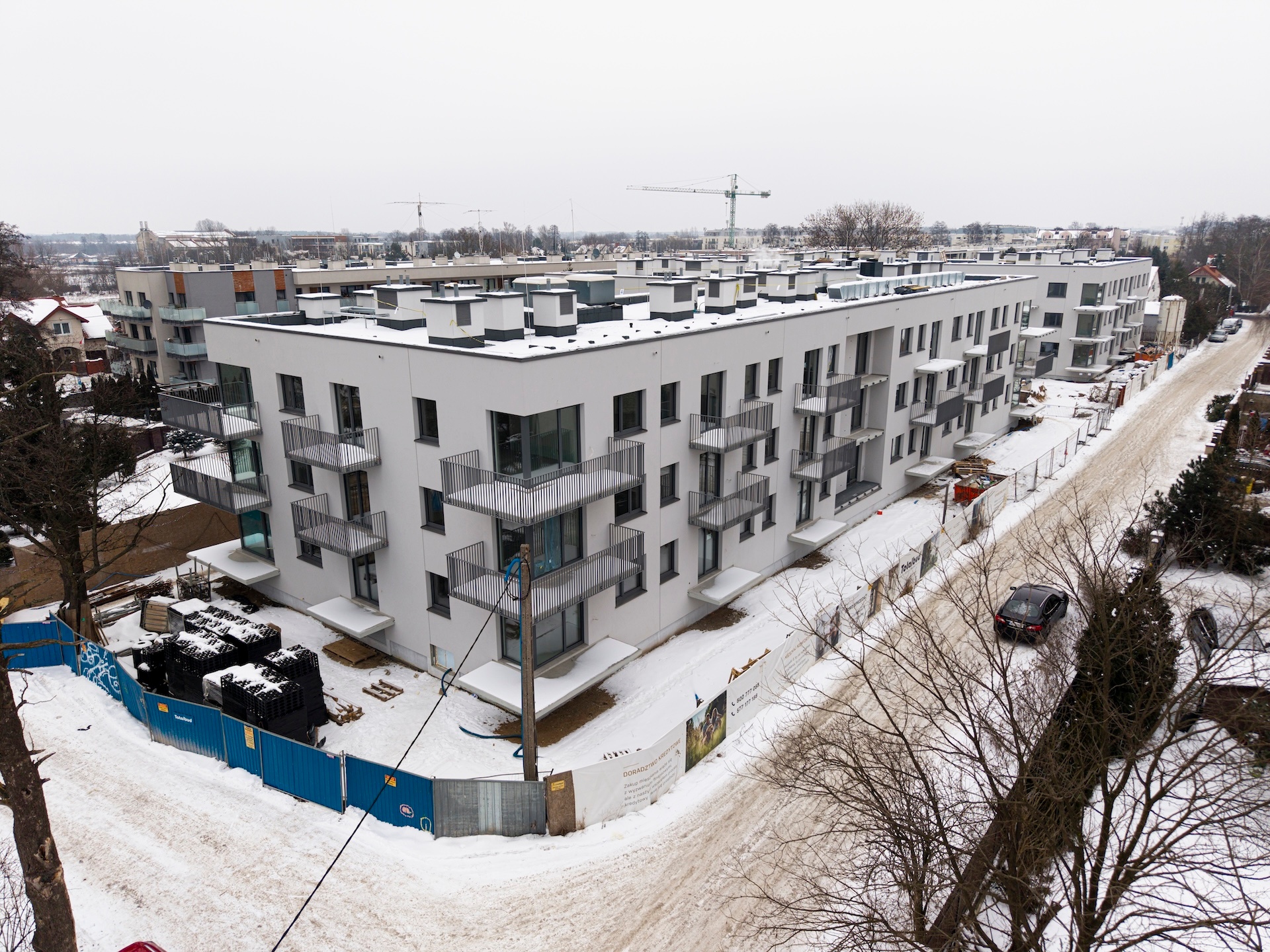 Instalacja elektryczna oraz sanitarna są na zaawansowanym etapie realizacji. Roboty elewacyjne zostały niemal całkowicie zakończone, podobnie jak tynki wewnętrzne. Trwają prace posadzkarskie oraz wykończeniowe w częściach wspólnych, w tym układanie gresów na korytarzach, schodach i w pomieszczeniach technicznych. Prowadzony jest montaż drzwi oraz balustrad balkonowych. Na zewnątrz budynku wykonano większość prac związanych z niwelacją terenu. Zakończono realizację przyłączy gazowych i światłowodowych, a kotłownia gazowa została uruchomiona i ogrzewa budynek.