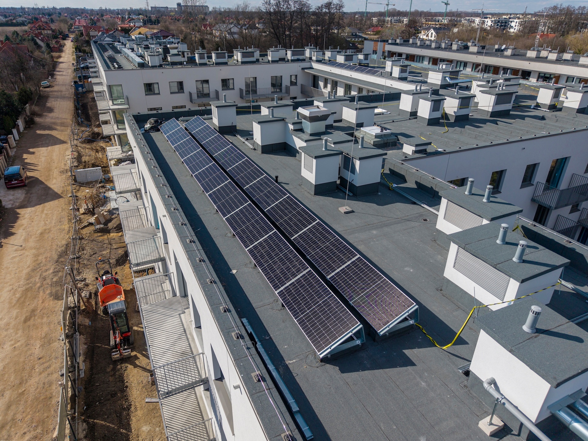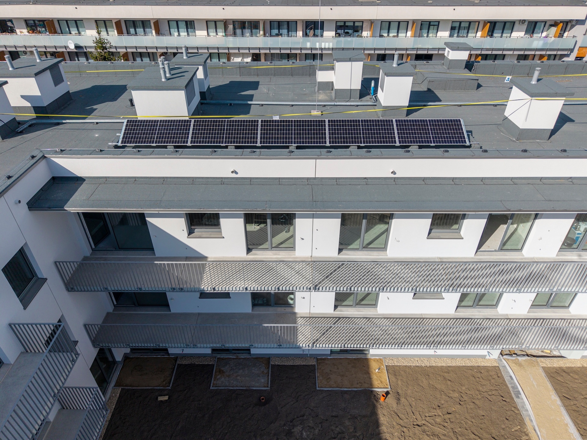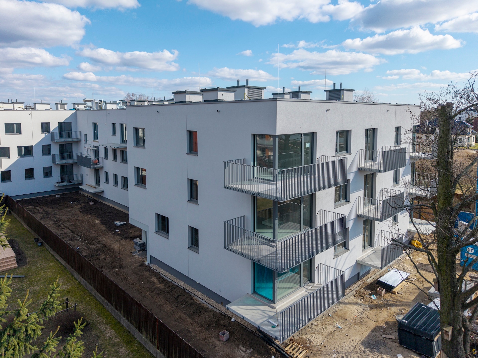 Zakończyliśmy wykonywanie tynków wewnętrznych oraz szlicht cementowych. Gotowe są także gresy na schodach i w pomieszczeniach technicznych. W budynku zamontowaliśmy już drzwi wewnętrzne i zewnętrzne oraz windy. Wykonane zostały przyłącza gazowe, wodociągowe i światłowodowe. Zakończyliśmy również wykończenie schodów głównych, wykonanie posadzki żywicznej w hali garażowej oraz wydzielenie boksów rowerowych i komórek lokatorskich. Obecnie kończymy instalacje elektryczne i sanitarne oraz prace nad elewacją. Finalizujemy układanie gresów na korytarzach i piętrach, a także montaż balustrad balkonowych. Instalacja fotowoltaiczna na dachu jest już na ostatnim etapie realizacji. Wewnątrz trwają prace wykończeniowe – montujemy balustrady na klatkach schodowych oraz malujemy korytarze i klatki. Równolegle zagospodarowujemy teren zewnętrzny: powstaje zieleń, ogrodzenia oraz chodniki w częściach wspólnych.