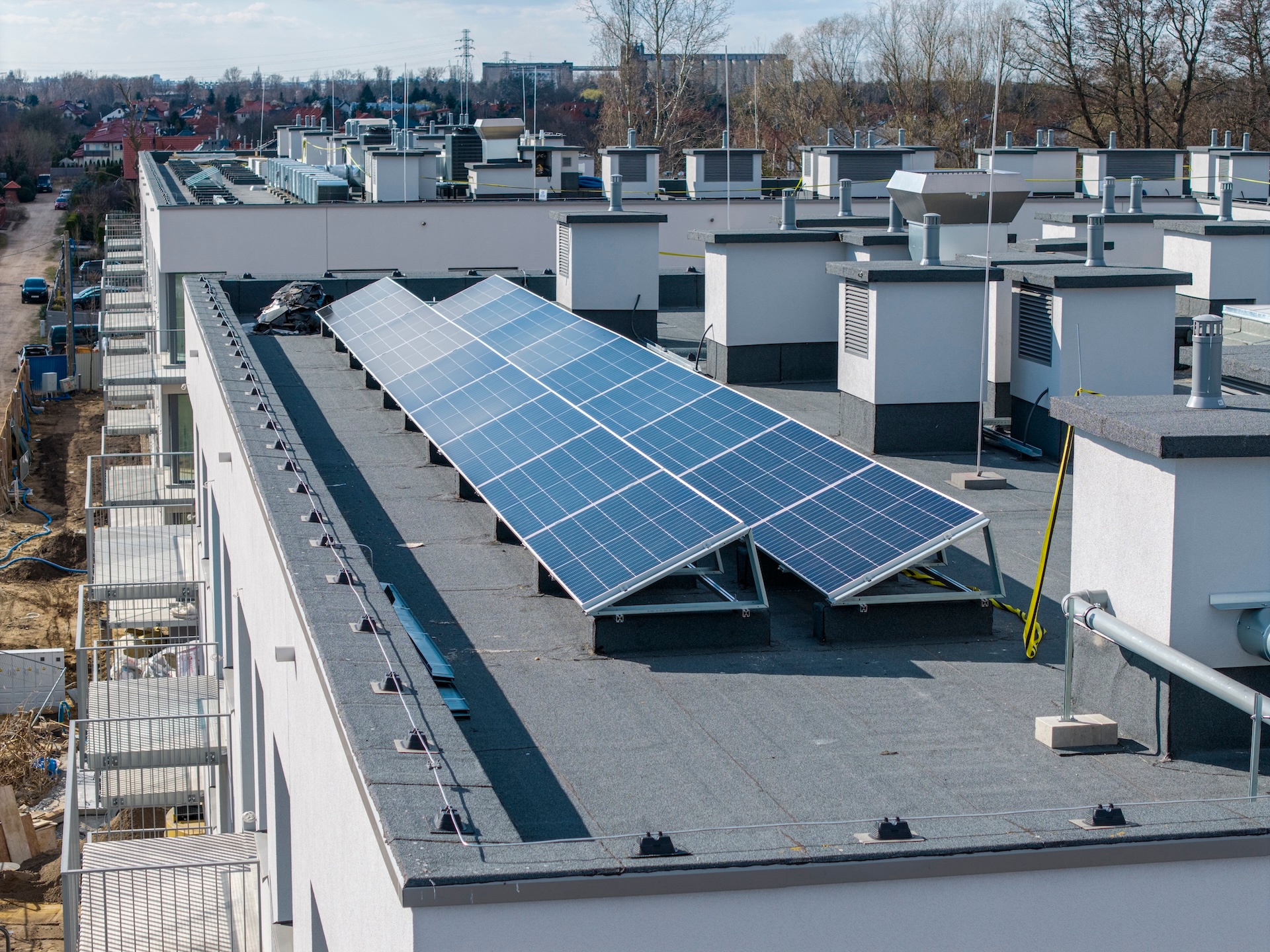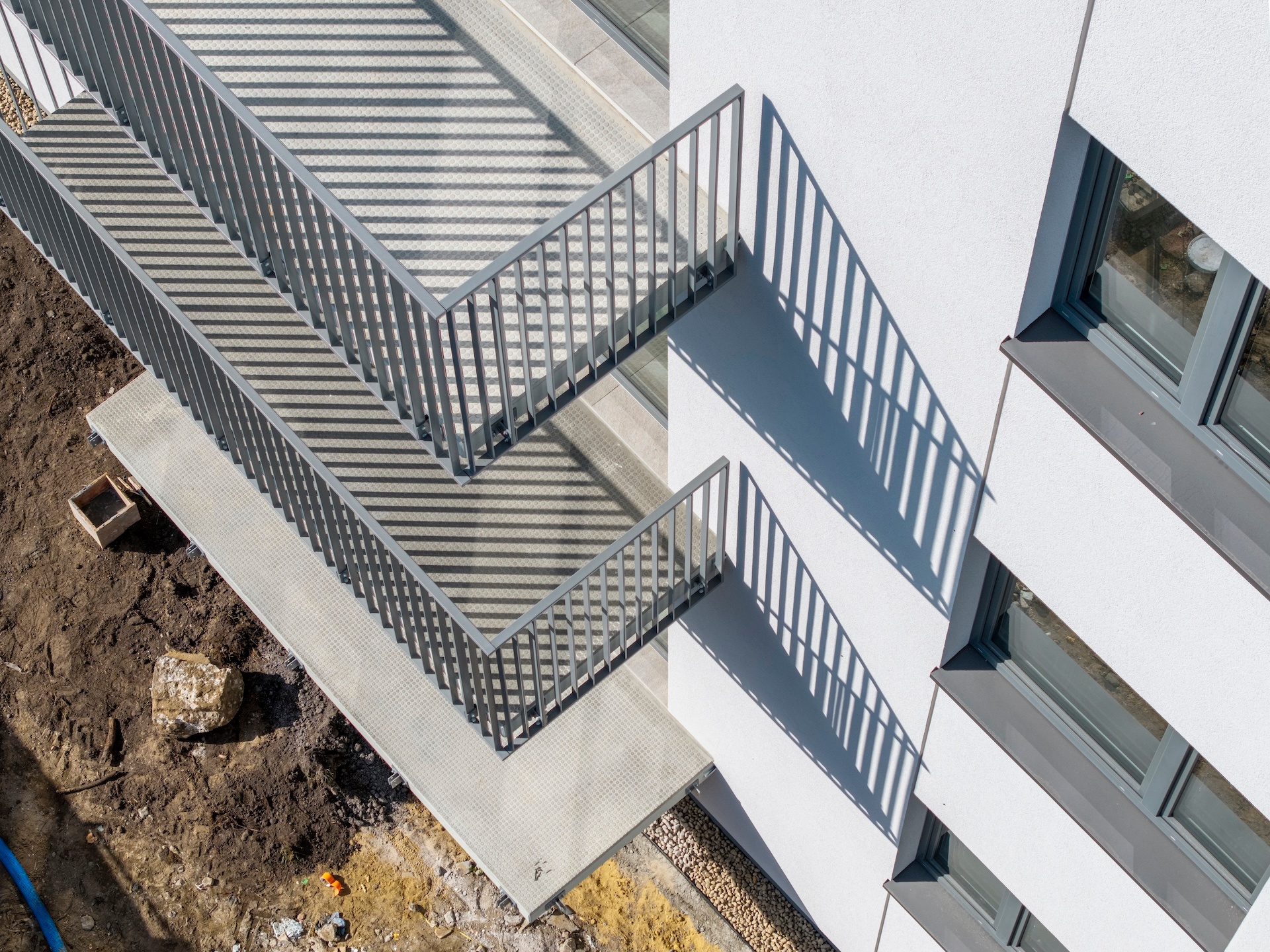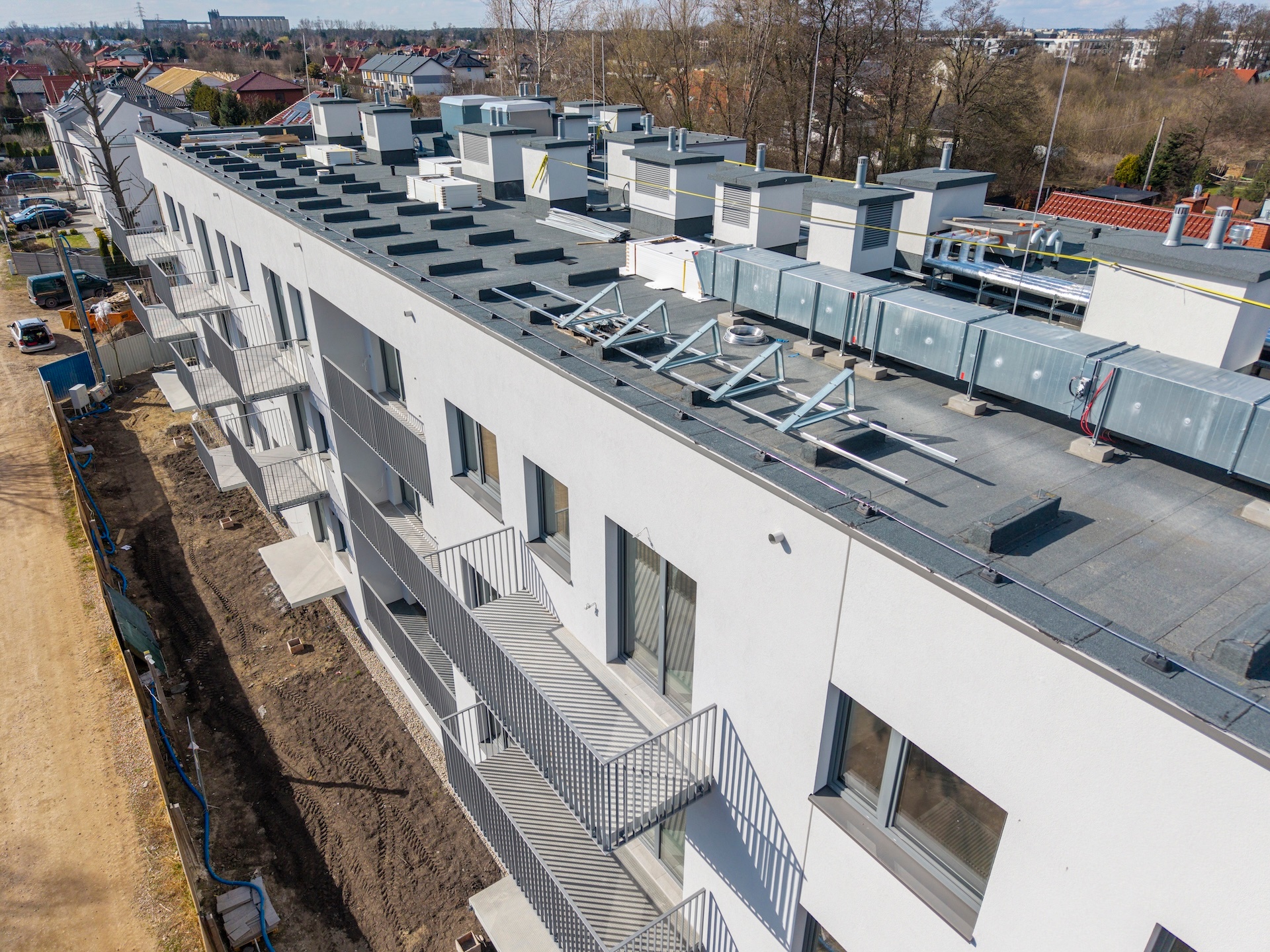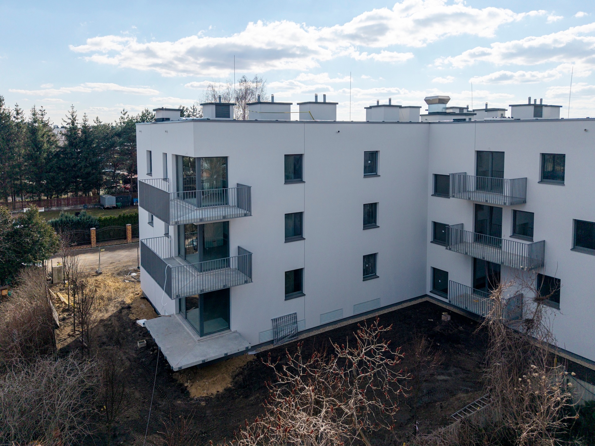 Zakończyliśmy wykonywanie tynków wewnętrznych oraz szlicht cementowych. Gotowe są także gresy na schodach i w pomieszczeniach technicznych. W budynku zamontowaliśmy już drzwi wewnętrzne i zewnętrzne oraz windy. Wykonane zostały przyłącza gazowe, wodociągowe i światłowodowe. Zakończyliśmy również wykończenie schodów głównych, wykonanie posadzki żywicznej w hali garażowej oraz wydzielenie boksów rowerowych i komórek lokatorskich. Obecnie kończymy instalacje elektryczne i sanitarne oraz prace nad elewacją. Finalizujemy układanie gresów na korytarzach i piętrach, a także montaż balustrad balkonowych. Instalacja fotowoltaiczna na dachu jest już na ostatnim etapie realizacji. Wewnątrz trwają prace wykończeniowe – montujemy balustrady na klatkach schodowych oraz malujemy korytarze i klatki. Równolegle zagospodarowujemy teren zewnętrzny: powstaje zieleń, ogrodzenia oraz chodniki w częściach wspólnych.