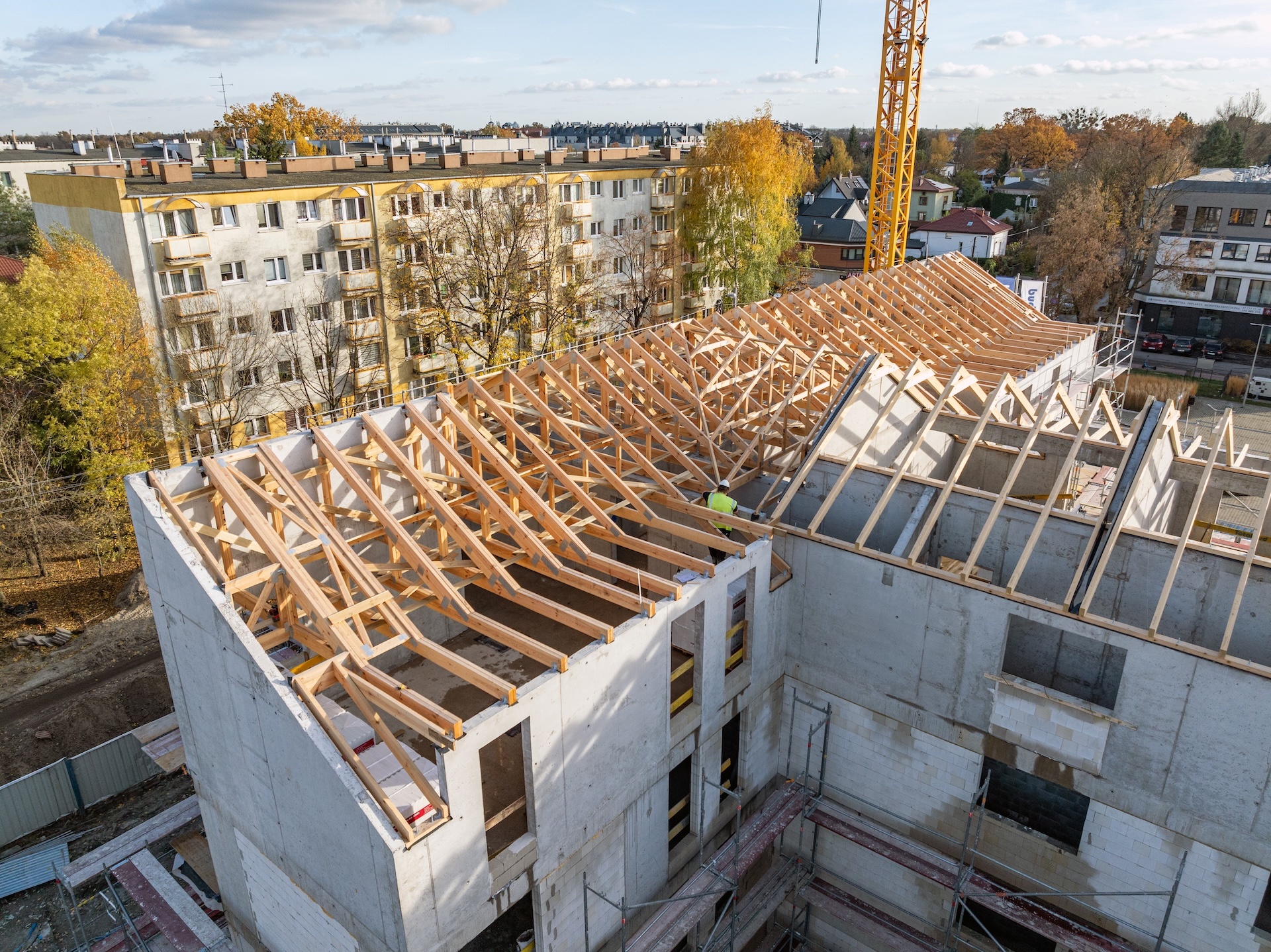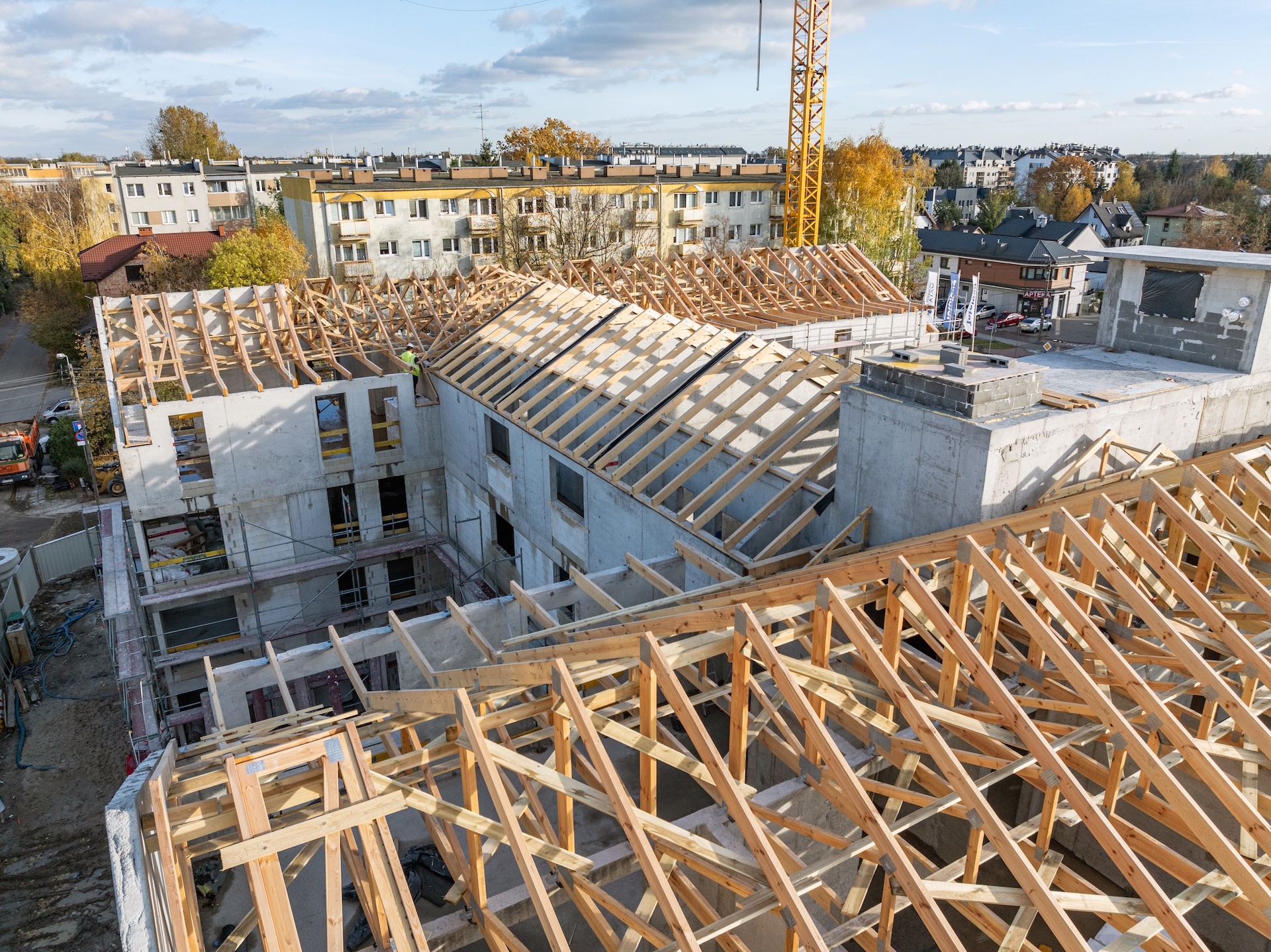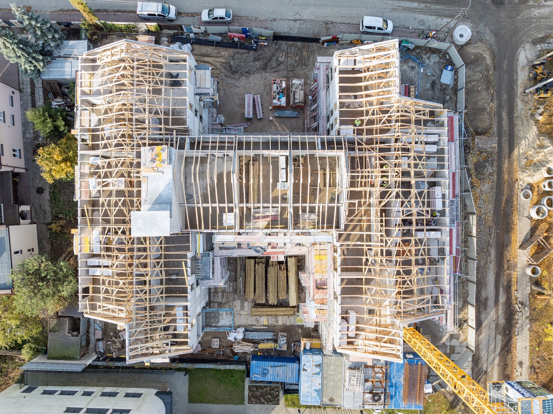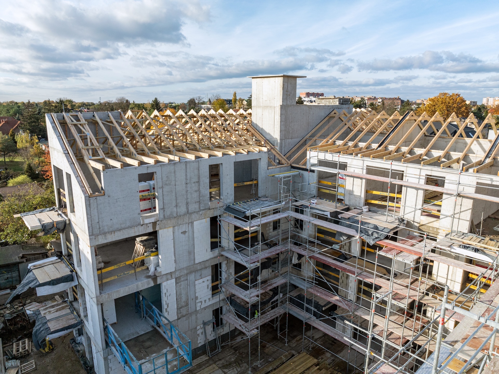 W tym tygodniu kończymy konstrukcję żelbetową pionów kondygnacji +4, a równolegle rozpoczynamy montaż więźby dachowej. Kolejnym etapem będzie wykonanie pokrycia dachowego. Do końca miesiąca planujemy zakończyć murowanie ścian osłonowych i międzylokalowych oraz murowanie ścian działowych na parterze, 1. i 2. piętrze.