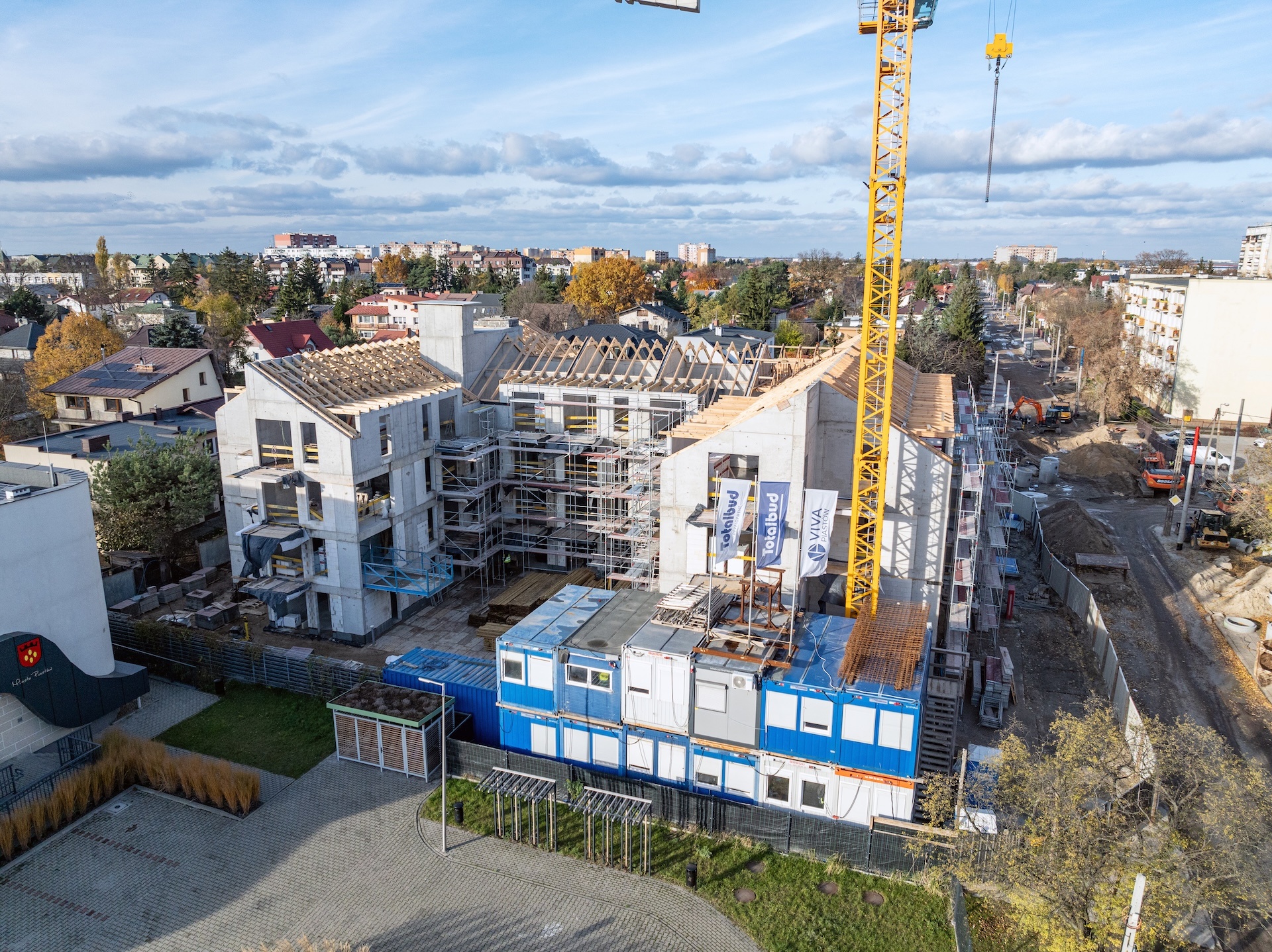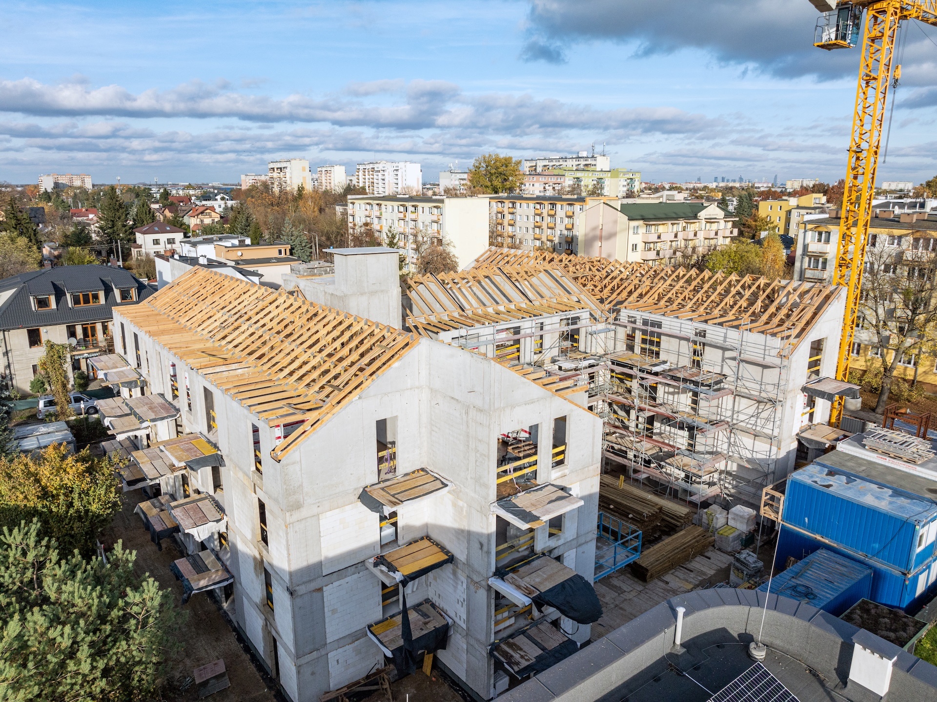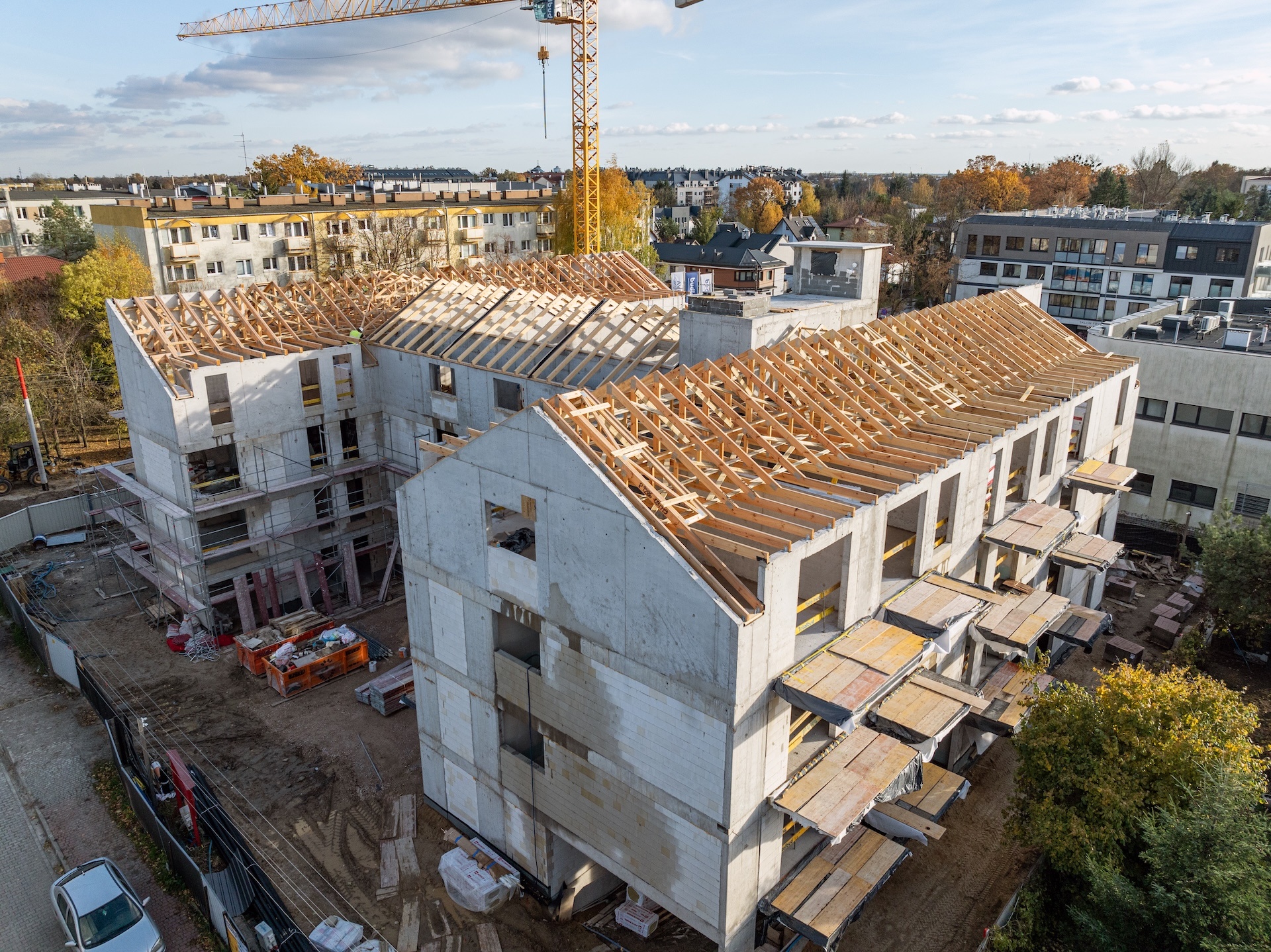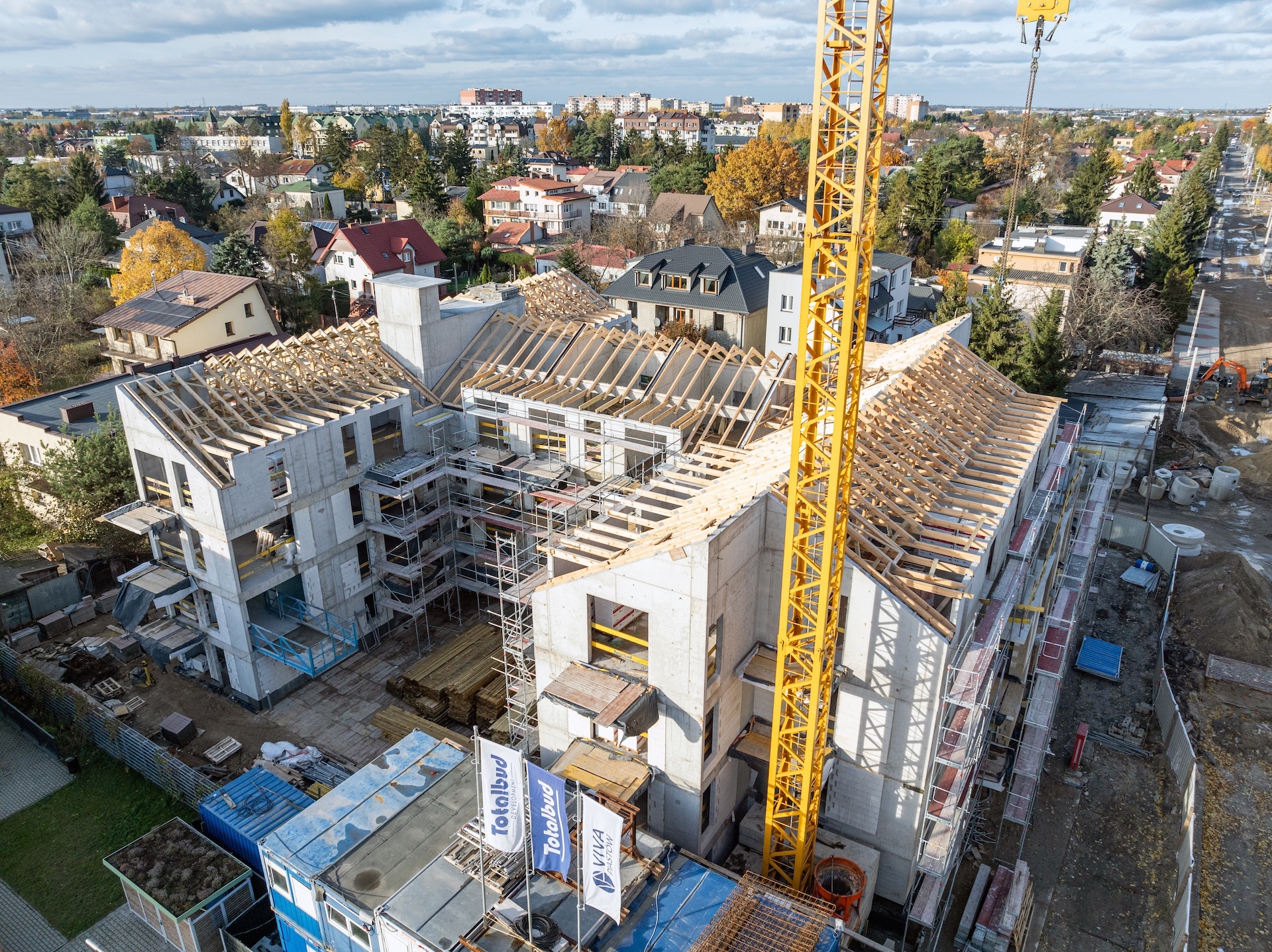 W tym tygodniu kończymy konstrukcję żelbetową pionów kondygnacji +4, a równolegle rozpoczynamy montaż więźby dachowej. Kolejnym etapem będzie wykonanie pokrycia dachowego. Do końca miesiąca planujemy zakończyć murowanie ścian osłonowych i międzylokalowych oraz murowanie ścian działowych na parterze, 1. i 2. piętrze.
